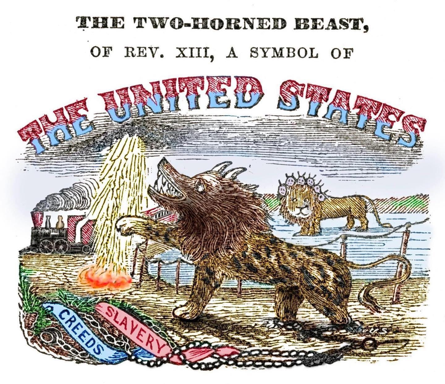 Perhaps most intriguingly, Adventist leaders repeatedly identified America as the “land beast” of Revelation 13—a beast which looked like a lamb but spoke like a dragon, and would bring persecution against God’s true followers—partly because of its practice of slavery. As the graphic above shows, they felt creeds and slavery were the two practices in America that identified it as this persecuting power.